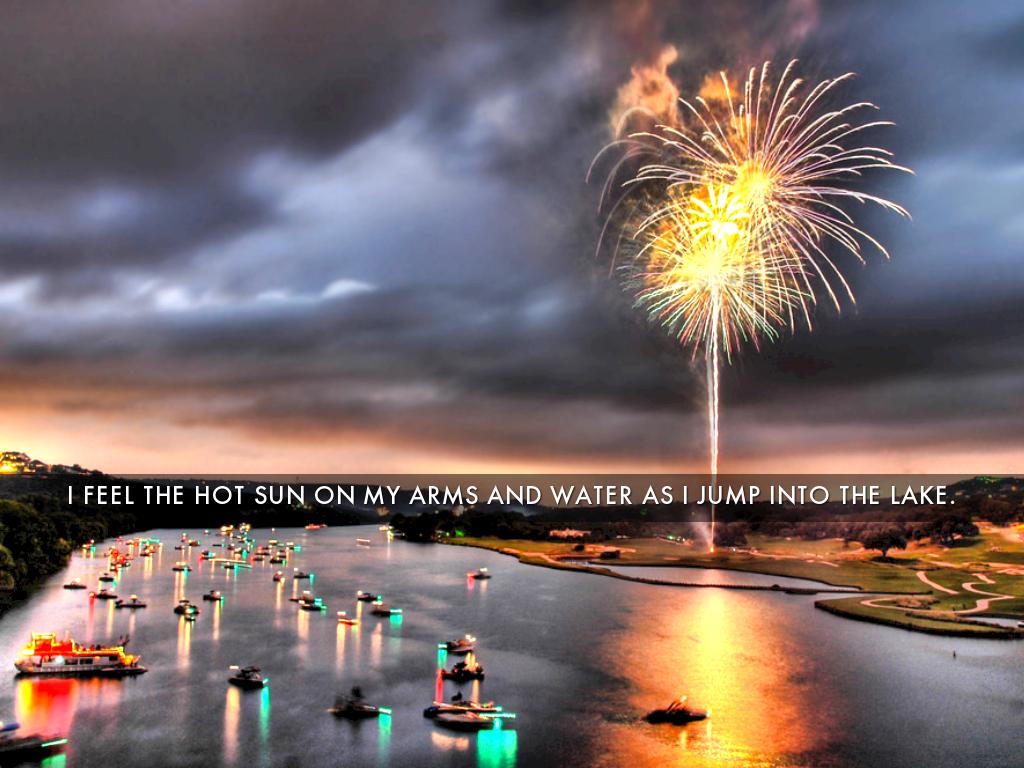 I FEEL THE HOT SUN ON MY ARMS AND WATER AS I JUMP INTO THE LAKE.