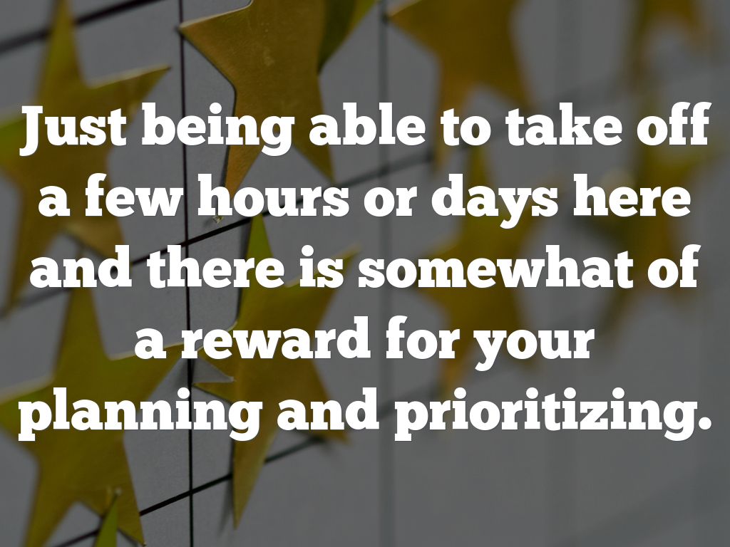 Just being able to take off a few hours or days here and there is somewhat of a reward for your planning and prioritizing.