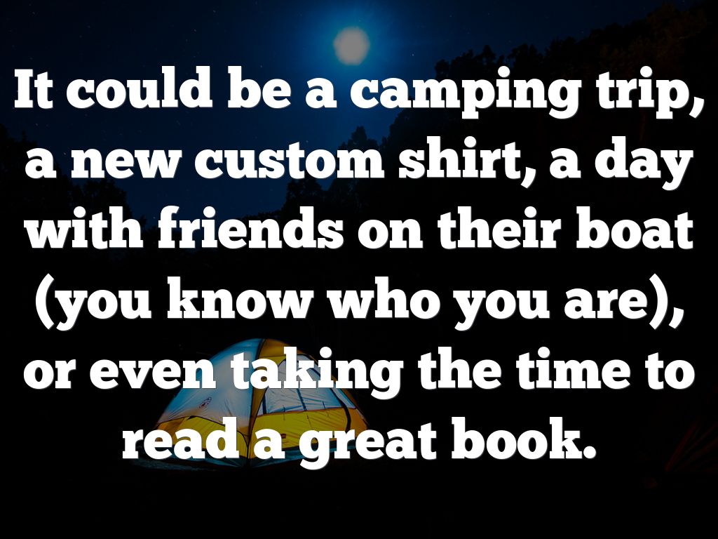 It could be a camping trip, a new custom shirt, a day with friends on their boat (you know who you are), or even taking the time to read a great book.