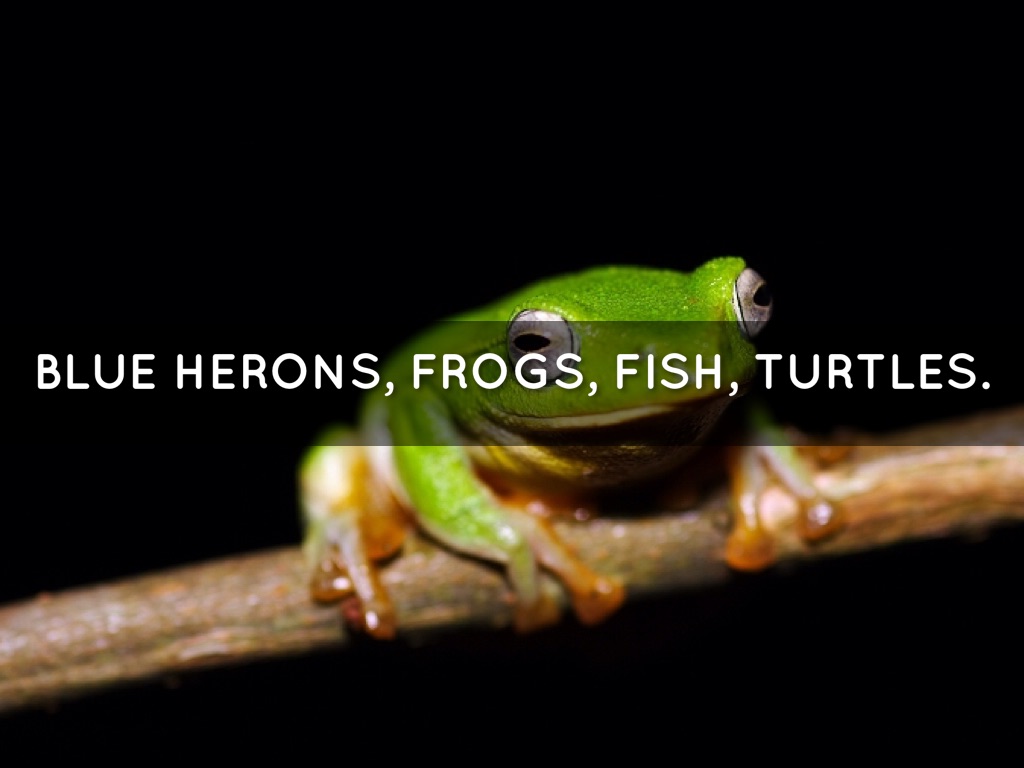 BLUE HERONS, FROGS, FISH, TURTLES.