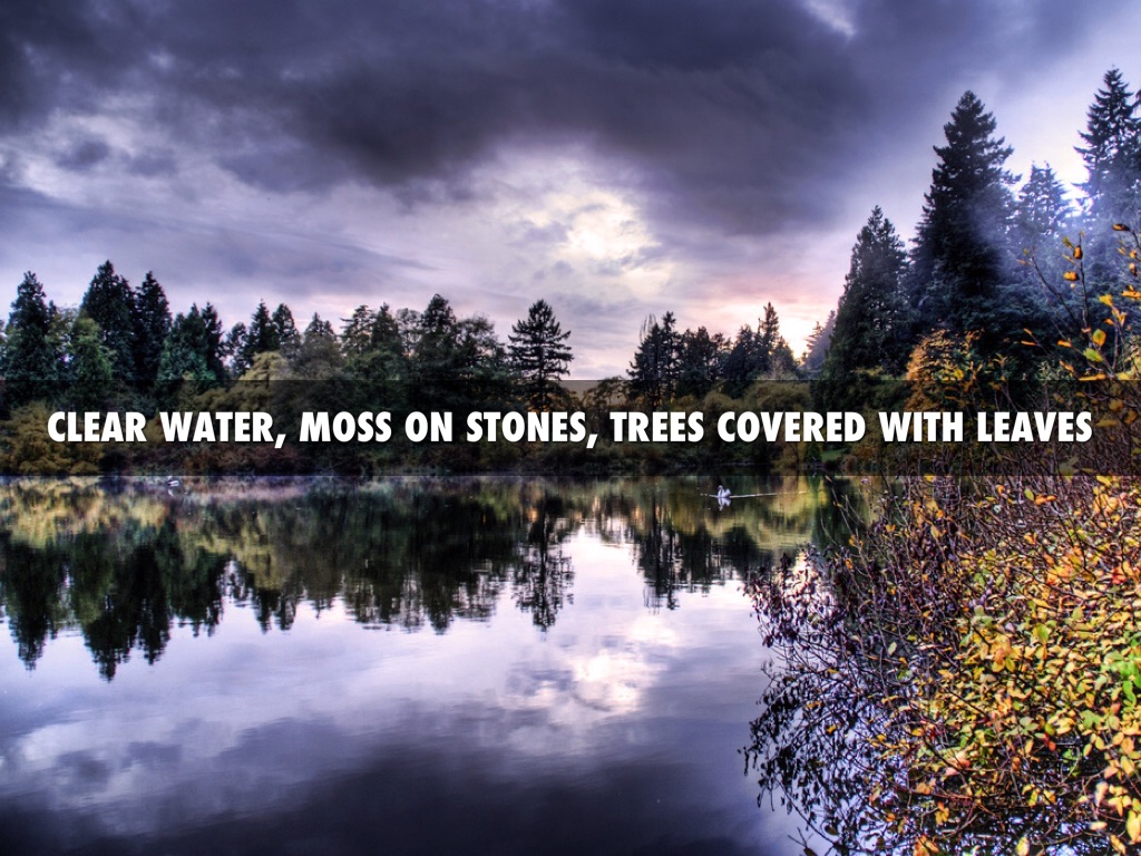 CLEAR WATER, MOSS ON STONES, TREES COVERED WITH LEAVES