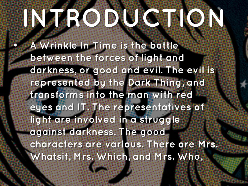 A Wrinkle In Time is the battle between the forces of light and darkness, or good and evil. The evil is represented by the Dark Thing, and transforms into the man with red eyes and IT. The representatives of light are involved in a struggle against darkness. The good characters are various. There are Mrs. Whatsit, Mrs. Which, and Mrs. Who, whose original forms, as seen as Uriel, seem to show bliss and joy. Mrs. Whatsit was originally a star that gave up its own life in the battle against darkness. The creatures on planet Ixchel are also defenders of the light against the darkness. Mr. Murry and the children are also on the side of the light.