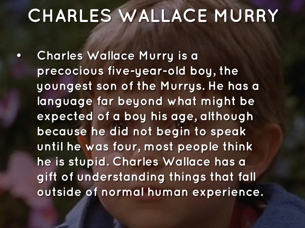 Charles Wallace Murry is a precocious five-year-old boy, the youngest son of the Murrys. He has a language far beyond what might be expected of a boy his age, although because he did not begin to speak until he was four, most people think he is stupid. Charles Wallace has a gift of understanding things that fall outside of normal human experience. It is he who first befriends the three ladies, and he has an amazing ability to know what others are thinking. He can even understand the wind talking to the trees. As a result, he is taken over by IT and only freed by Meg's love.