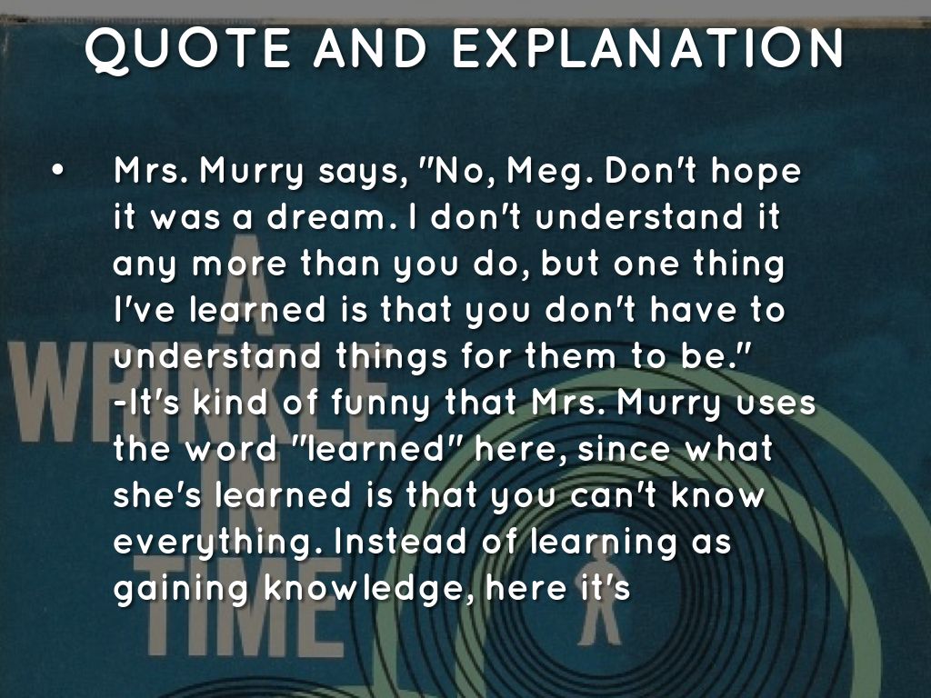 Mrs. Murry says, "No, Meg. Don't hope it was a dream. I don't understand it any more than you do, but one thing I've learned is that you don't have to understand things for them to be."