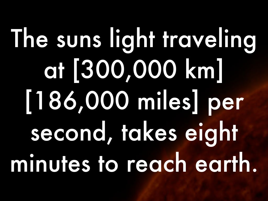 The suns light traveling at [300,000 km] [186,000 miles] per second, takes eight minutes to reach earth.