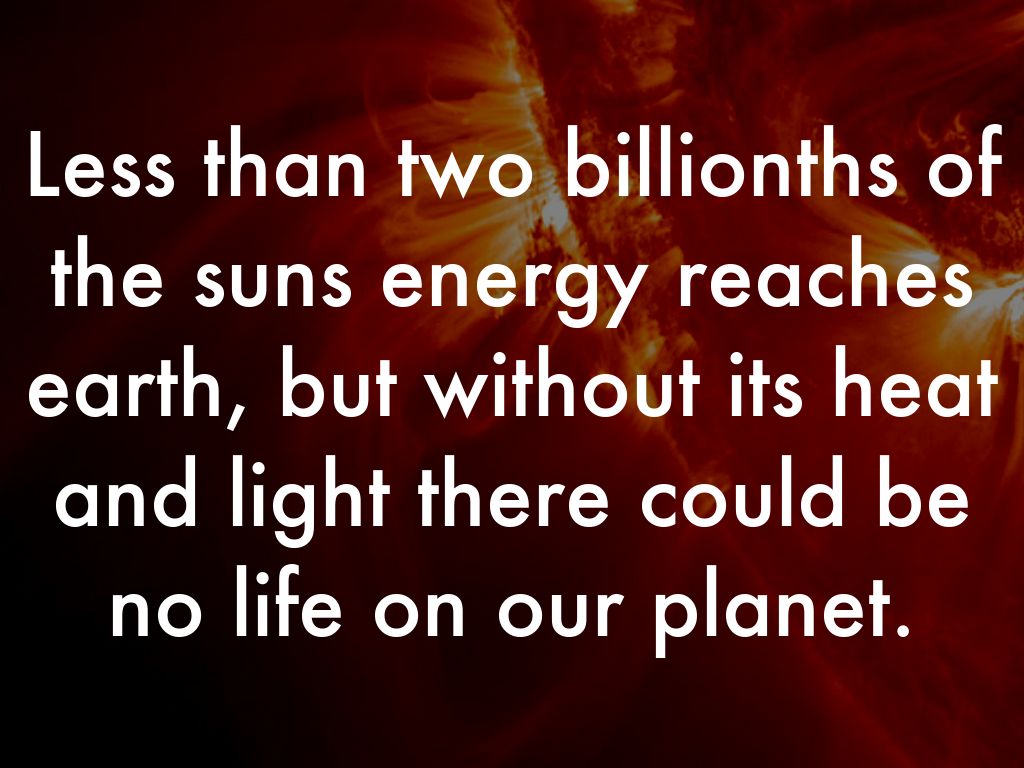 Less than two billionths of the suns energy reaches earth, but without its heat and light there could be no life on our planet.