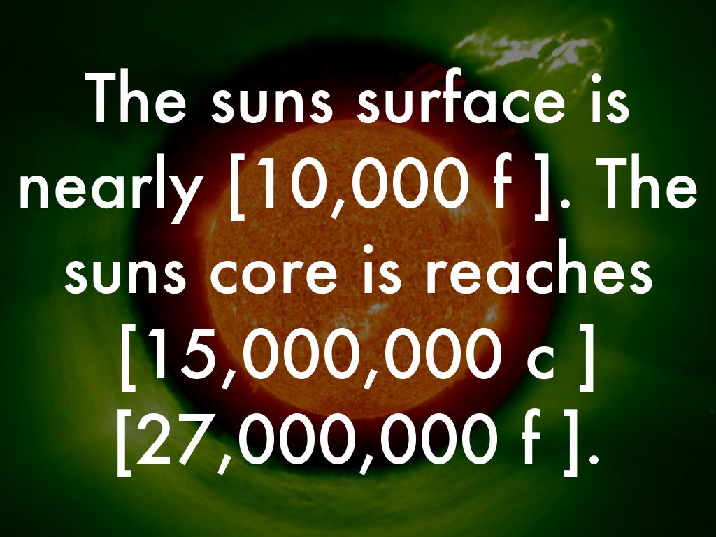 The suns surface is nearly [10,000 f ]. The suns core is reaches [15,000,000 c ] [27,000,000 f ].