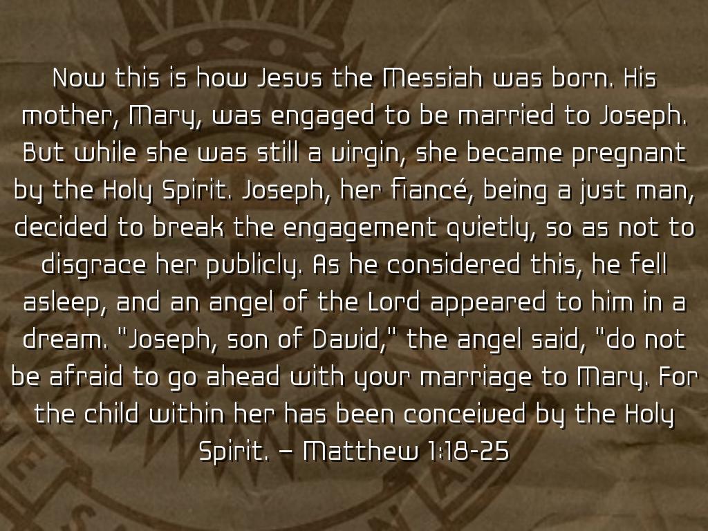 Now this is how Jesus the Messiah was born. His mother, Mary, was engaged to be married to Joseph. But while she was still a virgin, she became pregnant by the Holy Spirit. Joseph, her fiancé, being a just man, decided to break the engagement quietly, so as not to disgrace her publicly. As he considered this, he fell asleep, and an angel of the Lord appeared to him in a dream. "Joseph, son of David," the angel said, "do not be afraid to go ahead with your marriage to Mary. For the child within her has been conceived by the Holy Spirit. – Matthew 1:18-25