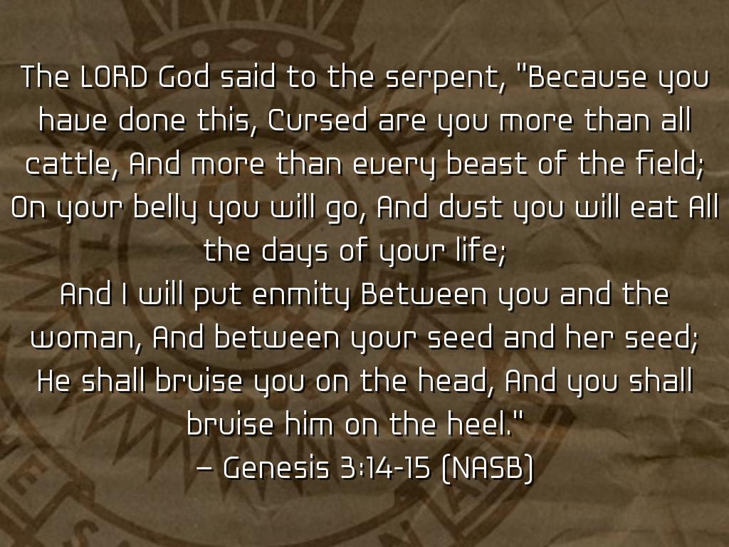 And I will put enmity Between you and the woman, And between your seed and her seed; He shall bruise you on the head, And you shall bruise him on the heel."