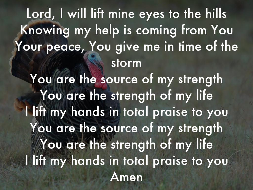 Lord, I will lift mine eyes to the hills Knowing my help is coming from You Your peace, You give me in time of the storm You are the source of my strength You are the strength of my life I lift my hands in total praise to you You are the source of my strength You are the strength of my life I lift my hands in total praise to you Amen