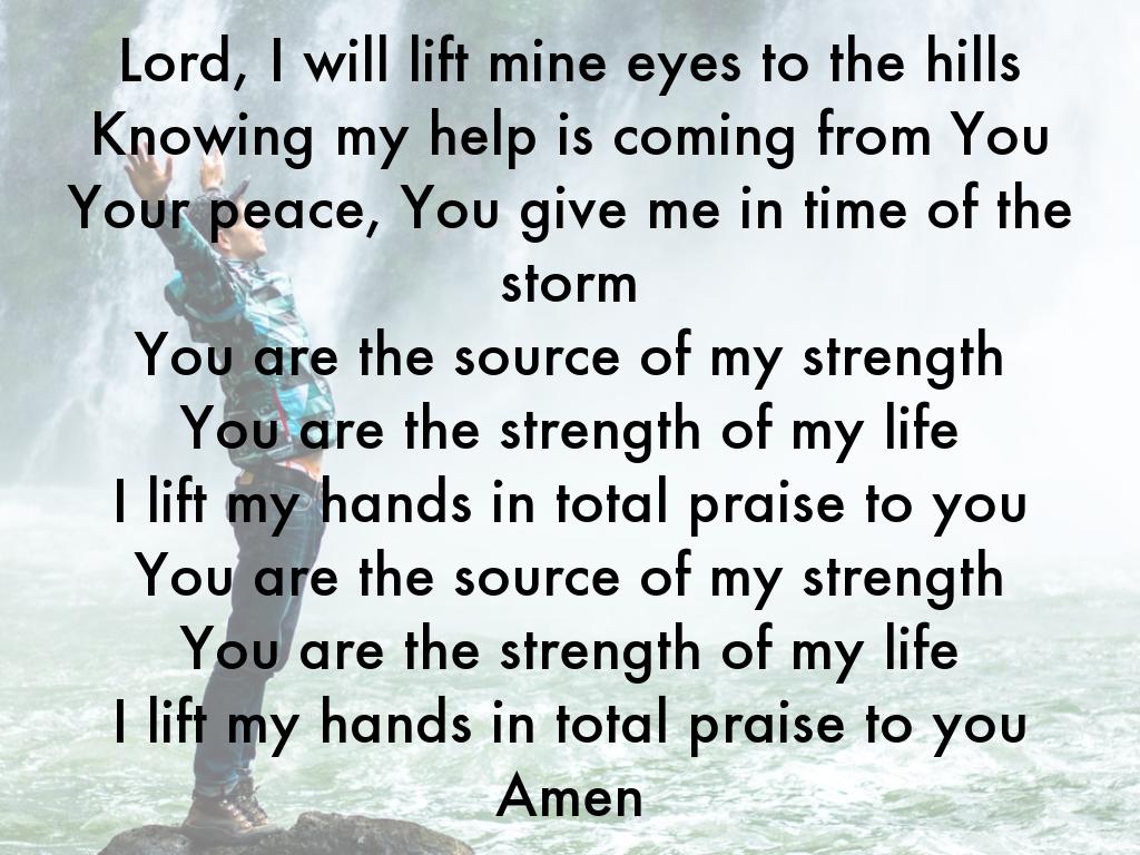 Lord, I will lift mine eyes to the hills Knowing my help is coming from You Your peace, You give me in time of the storm You are the source of my strength You are the strength of my life I lift my hands in total praise to you You are the source of my strength You are the strength of my life I lift my hands in total praise to you Amen