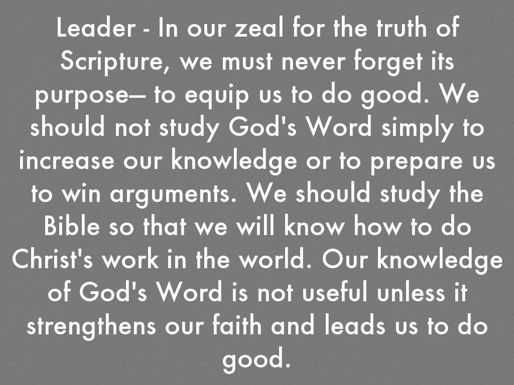 Leader - In our zeal for the truth of Scripture, we must never forget its purpose— to equip us to do good. We should not study God's Word simply to increase our knowledge or to prepare us to win arguments. We should study the Bible so that we will know how to do Christ's work in the world. Our knowledge of God's Word is not useful unless it strengthens our faith and leads us to do good.