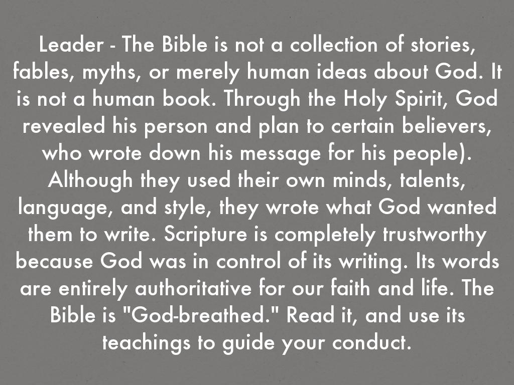 Leader - The Bible is not a collection of stories, fables, myths, or merely human ideas about God. It is not a human book. Through the Holy Spirit, God revealed his person and plan to certain believers, who wrote down his message for his people). Although they used their own minds, talents, language, and style, they wrote what God wanted them to write. Scripture is completely trustworthy because God was in control of its writing. Its words are entirely authoritative for our faith and life. The Bible is "God-breathed." Read it, and use its teachings to guide your conduct.