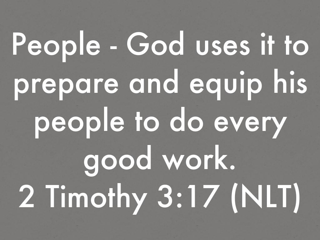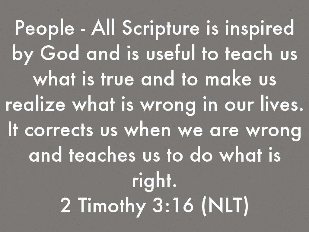 People - All Scripture is inspired by God and is useful to teach us what is true and to make us realize what is wrong in our lives. It corrects us when we are wrong and teaches us to do what is right.
