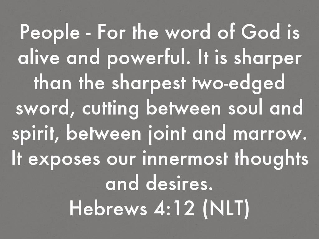 People - For the word of God is alive and powerful. It is sharper than the sharpest two-edged sword, cutting between soul and spirit, between joint and marrow. It exposes our innermost thoughts and desires.