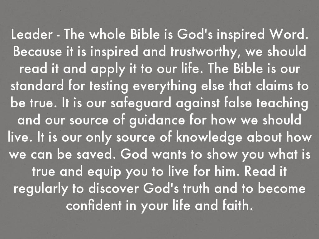 Leader - The whole Bible is God's inspired Word. Because it is inspired and trustworthy, we should read it and apply it to our life. The Bible is our standard for testing everything else that claims to be true. It is our safeguard against false teaching and our source of guidance for how we should live. It is our only source of knowledge about how we can be saved. God wants to show you what is true and equip you to live for him. Read it regularly to discover God's truth and to become confident in your life and faith.