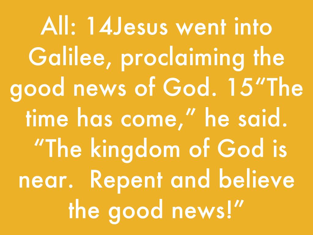 All: 14Jesus went into Galilee, proclaiming the good news of God. 15“The time has come,” he said. “The kingdom of God is near. Repent and believe the good news!”