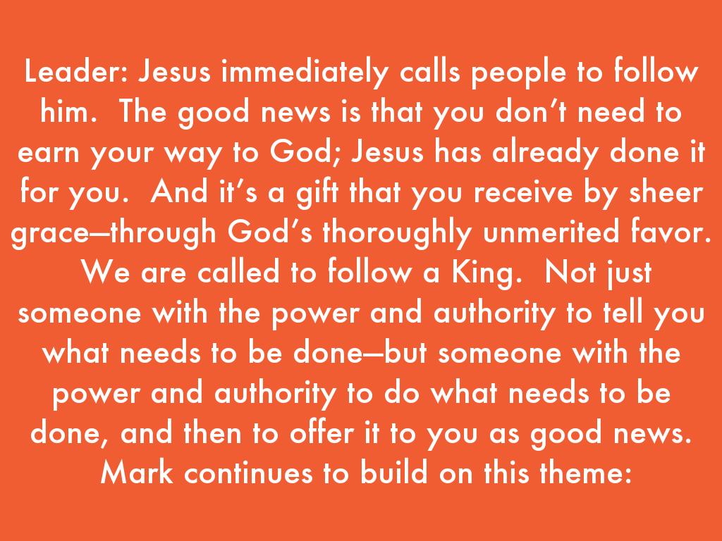 Leader: Jesus immediately calls people to follow him. The good news is that you don’t need to earn your way to God; Jesus has already done it for you. And it’s a gift that you receive by sheer grace—through God’s thoroughly unmerited favor. We are called to follow a King. Not just someone with the power and authority to tell you what needs to be done—but someone with the power and authority to do what needs to be done, and then to offer it to you as good news. Mark continues to build on this theme: