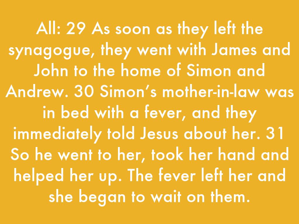 All: 29 As soon as they left the synagogue, they went with James and John to the home of Simon and Andrew. 30 Simon’s mother-in-law was in bed with a fever, and they immediately told Jesus about her. 31 So he went to her, took her hand and helped her up. The fever left her and she began to wait on them.
