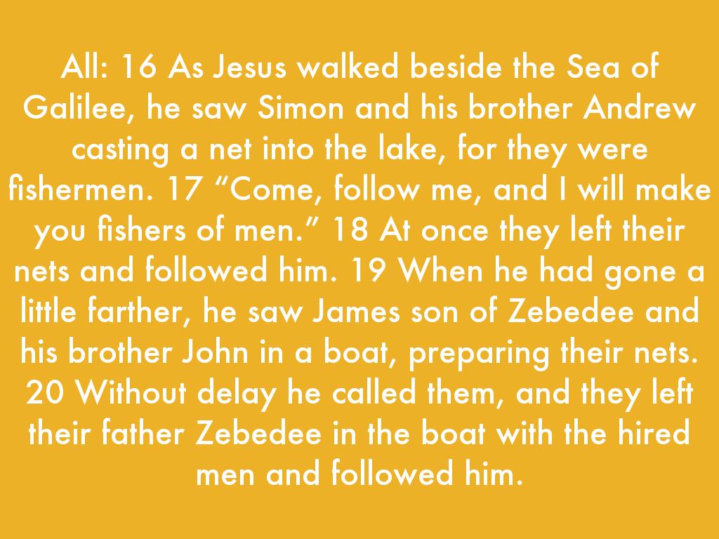 All: 16 As Jesus walked beside the Sea of Galilee, he saw Simon and his brother Andrew casting a net into the lake, for they were fishermen. 17 “Come, follow me, and I will make you fishers of men.” 18 At once they left their nets and followed him. 19 When he had gone a little farther, he saw James son of Zebedee and his brother John in a boat, preparing their nets. 20 Without delay he called them, and they left their father Zebedee in the boat with the hired men and followed him.