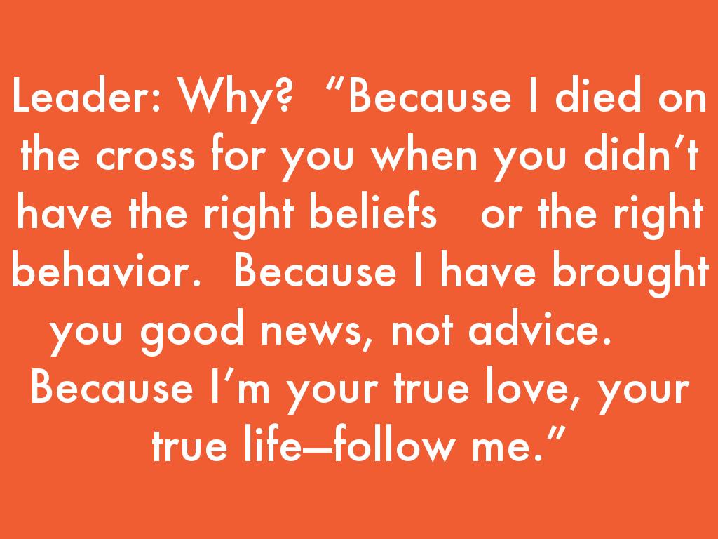 Leader: Why? “Because I died on the cross for you when you didn’t have the right beliefs or the right behavior. Because I have brought you good news, not advice. Because I’m your true love, your true life—follow me.”
