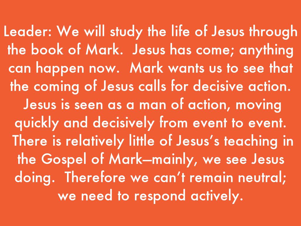 Leader: We will study the life of Jesus through the book of Mark. Jesus has come; anything can happen now. Mark wants us to see that the coming of Jesus calls for decisive action. Jesus is seen as a man of action, moving quickly and decisively from event to event. There is relatively little of Jesus’s teaching in the Gospel of Mark—mainly, we see Jesus doing. Therefore we can’t remain neutral; we need to respond actively.
