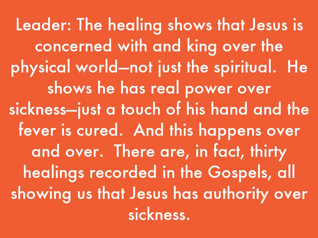 Leader: The healing shows that Jesus is concerned with and king over the physical world—not just the spiritual. He shows he has real power over sickness—just a touch of his hand and the fever is cured. And this happens over and over. There are, in fact, thirty healings recorded in the Gospels, all showing us that Jesus has authority over sickness.