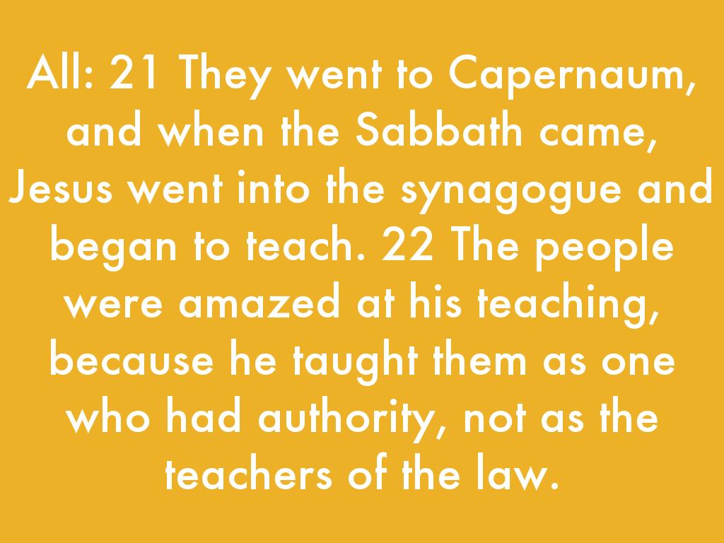 All: 21 They went to Capernaum, and when the Sabbath came, Jesus went into the synagogue and began to teach. 22 The people were amazed at his teaching, because he taught them as one who had authority, not as the teachers of the law.