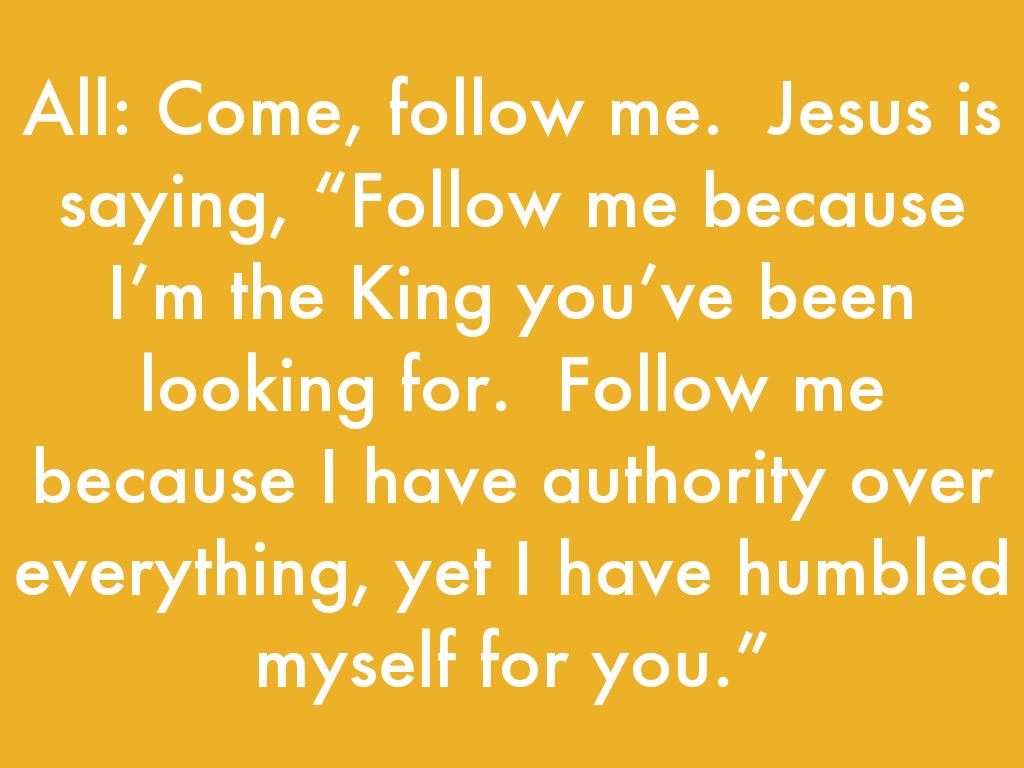 All: Come, follow me. Jesus is saying, “Follow me because I’m the King you’ve been looking for. Follow me because I have authority over everything, yet I have humbled myself for you.”