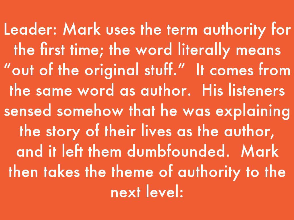 Leader: Mark uses the term authority for the first time; the word literally means “out of the original stuff.” It comes from the same word as author. His listeners sensed somehow that he was explaining the story of their lives as the author, and it left them dumbfounded. Mark then takes the theme of authority to the next level: