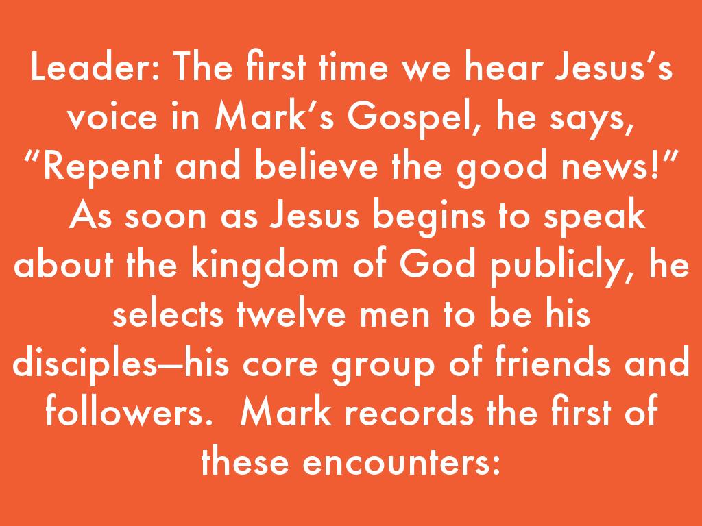 Leader: The first time we hear Jesus’s voice in Mark’s Gospel, he says, “Repent and believe the good news!” As soon as Jesus begins to speak about the kingdom of God publicly, he selects twelve men to be his disciples—his core group of friends and followers. Mark records the first of these encounters: