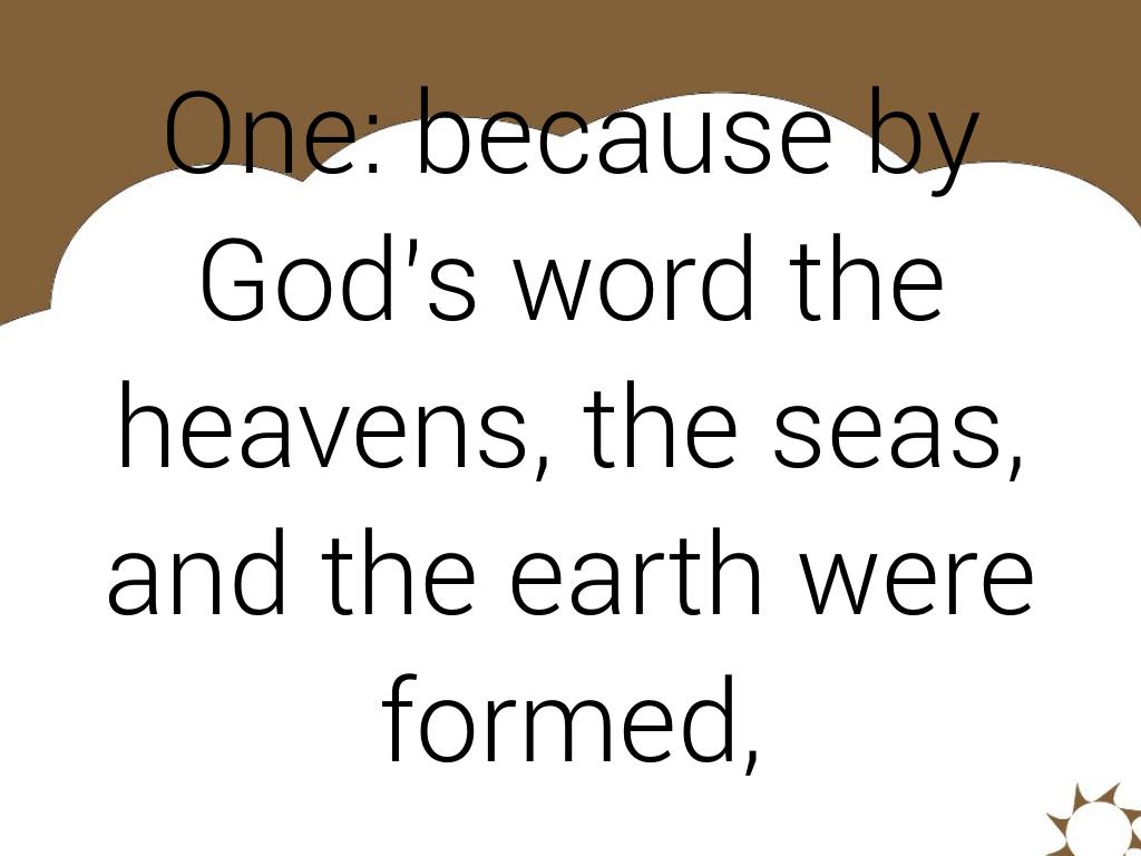 One: because by God’s word the heavens, the seas, and the earth were formed,