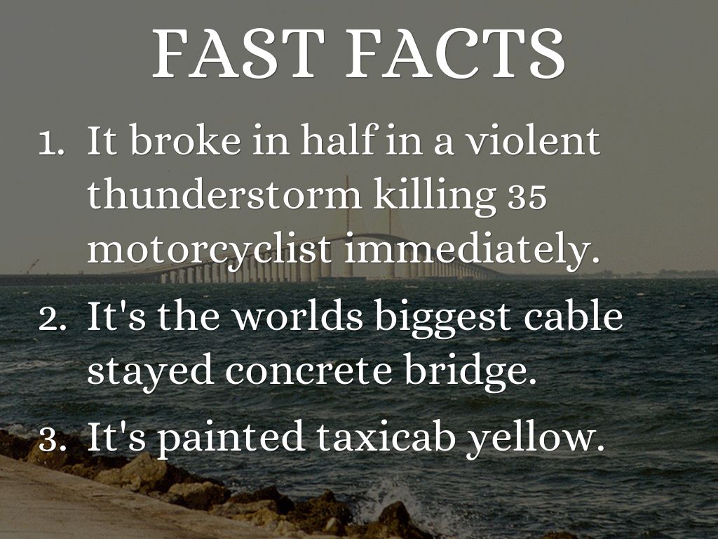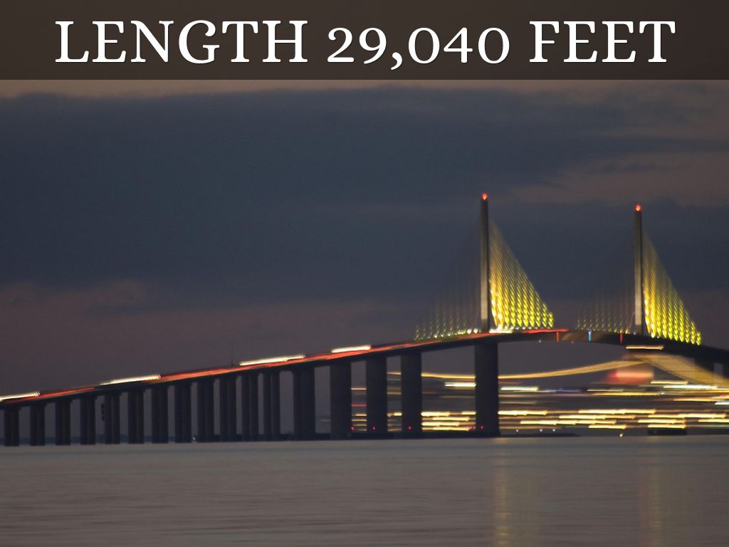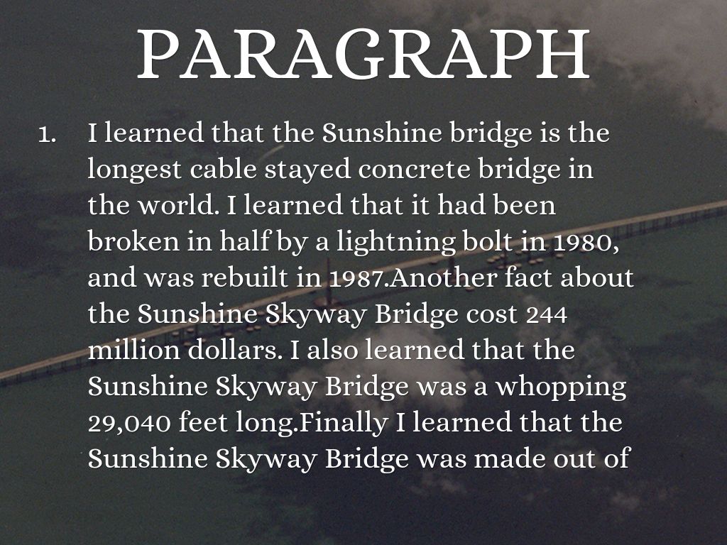 I learned that the Sunshine bridge is the longest cable stayed concrete bridge in the world. I learned that it had been broken in half by a lightning bolt in 1980, and was rebuilt in 1987.Another fact about the Sunshine Skyway Bridge cost 244 million dollars. I also learned that the Sunshine Skyway Bridge was a whopping 29,040 feet long.Finally I learned that the Sunshine Skyway Bridge was made out of steel and concrete.