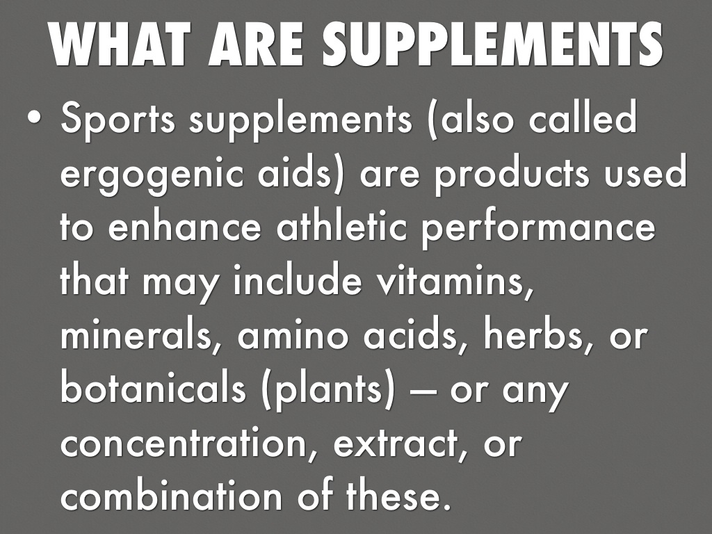 • Sports supplements (also called ergogenic aids) are products used to enhance athletic performance that may include vitamins, minerals, amino acids, herbs, or botanicals (plants) — or any concentration, extract, or combination of these.