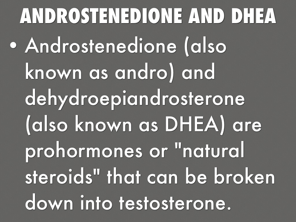 • Androstenedione (also known as andro) and dehydroepiandrosterone (also known as DHEA) are prohormones or "natural steroids" that can be broken down into testosterone.