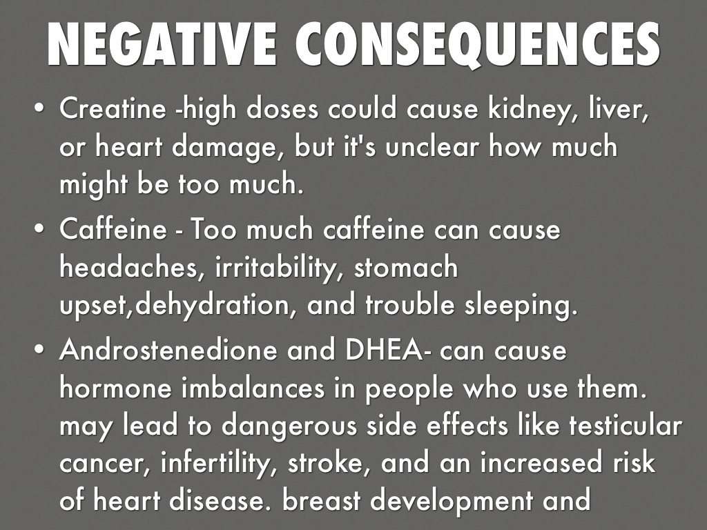 • Androstenedione and DHEA- can cause hormone imbalances in people who use them. may lead to dangerous side effects like testicular cancer, infertility, stroke, and an increased risk of heart disease. breast development and shrinking of testicles in guys
