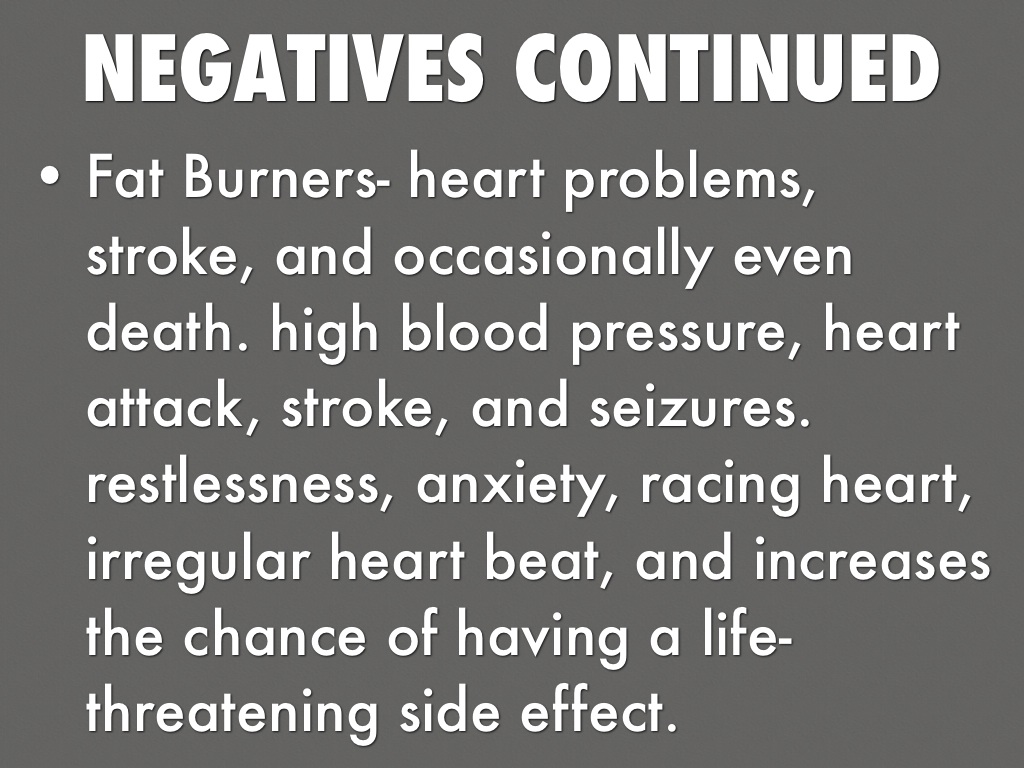 • Fat Burners- heart problems, stroke, and occasionally even death. high blood pressure, heart attack, stroke, and seizures. restlessness, anxiety, racing heart, irregular heart beat, and increases the chance of having a life-threatening side effect.