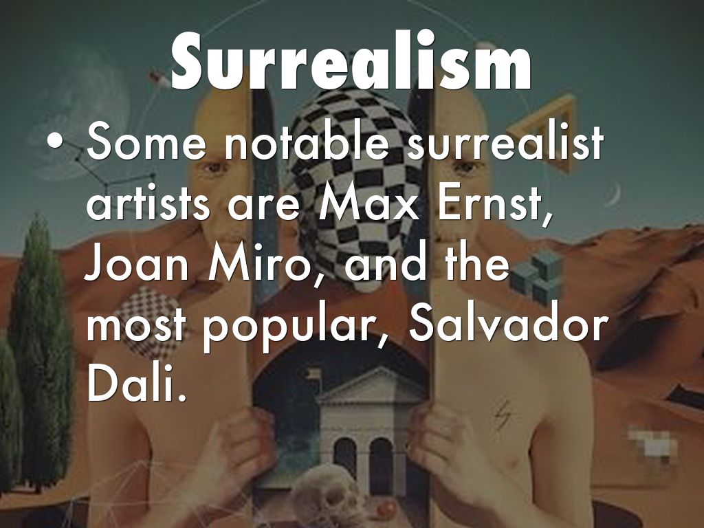 • Some notable surrealist artists are Max Ernst, Joan Miro, and the most popular, Salvador Dali.