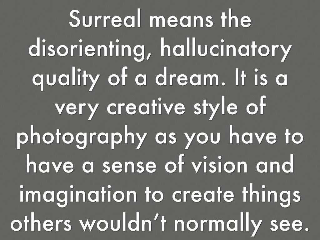 Surreal means the disorienting, hallucinatory quality of a dream. It is a very creative style of photography as you have to have a sense of vision and imagination to create things others wouldn’t normally see.