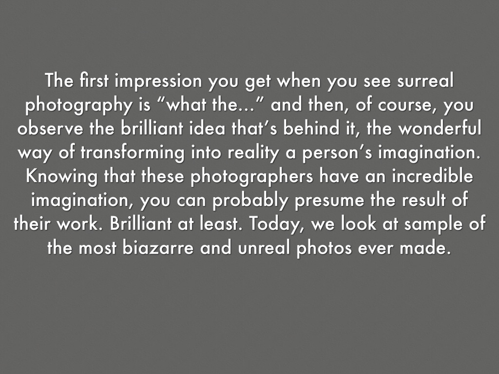 The first impression you get when you see surreal photography is “what the…” and then, of course, you observe the brilliant idea that’s behind it, the wonderful way of transforming into reality a person’s imagination. Knowing that these photographers have an incredible imagination, you can probably presume the result of their work. Brilliant at least. Today, we look at sample of the most biazarre and unreal photos ever made.