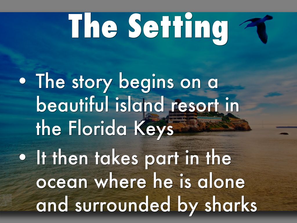 • It then takes part in the ocean where he is alone and surrounded by sharks