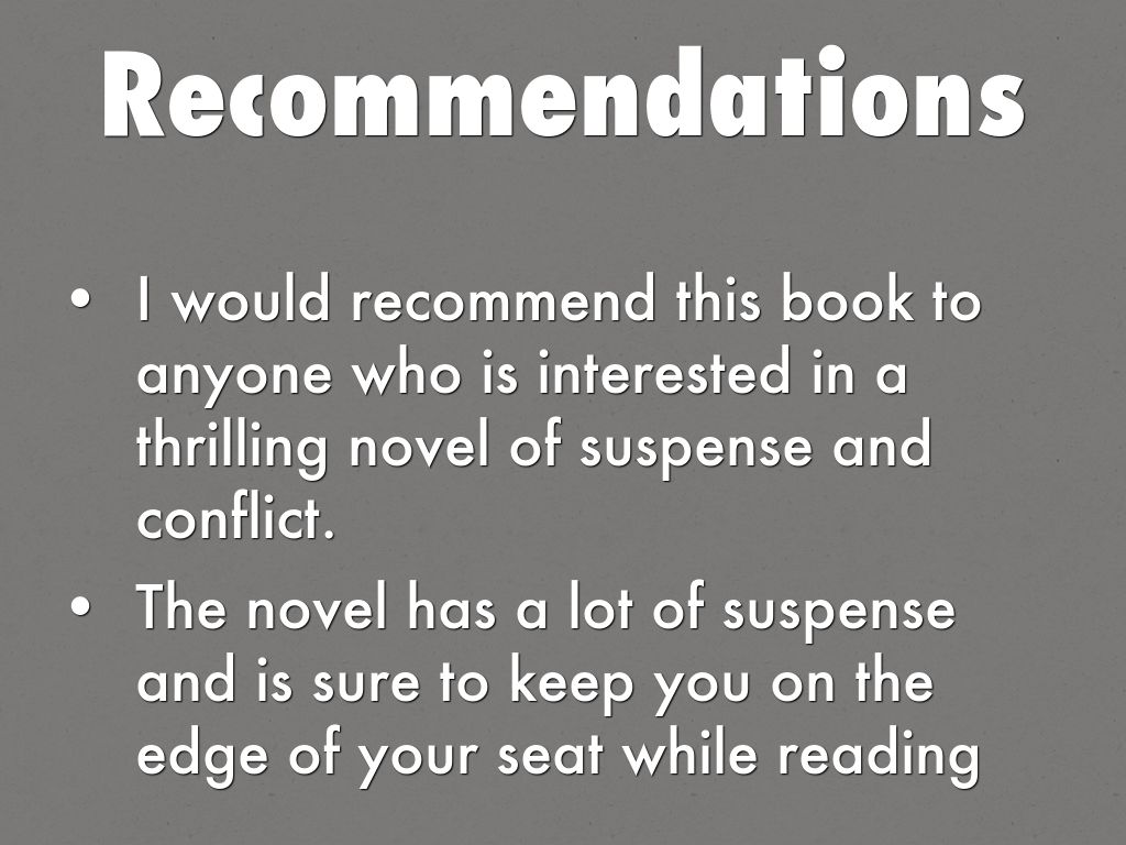 • I would recommend this book to anyone who is interested in a thrilling novel of suspense and conflict.