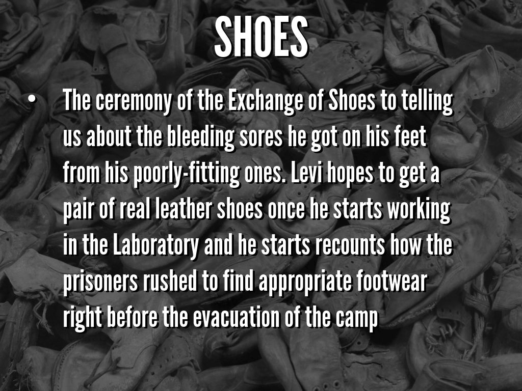 The ceremony of the Exchange of Shoes to telling us about the bleeding sores he got on his feet from his poorly-fitting ones. Levi hopes to get a pair of real leather shoes once he starts working in the Laboratory and he starts recounts how the prisoners rushed to find appropriate footwear right before the evacuation of the camp
