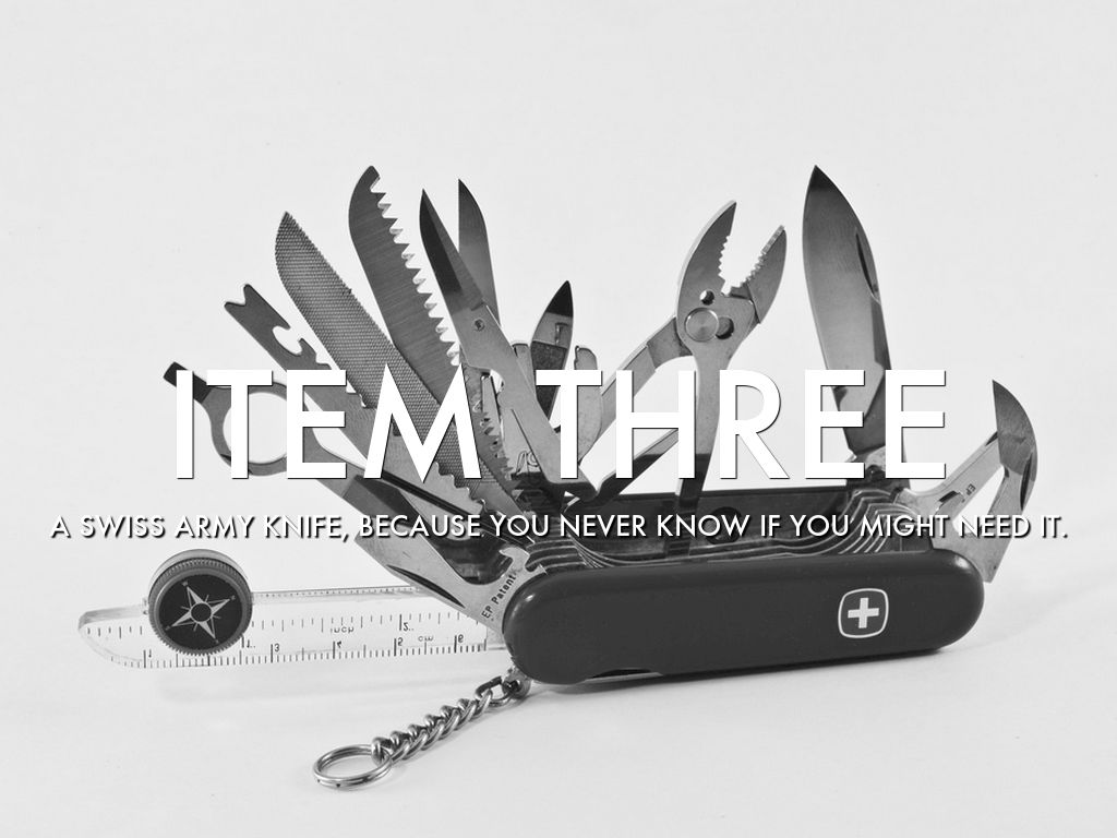 A SWISS ARMY KNIFE, BECAUSE YOU NEVER KNOW IF YOU MIGHT NEED IT.