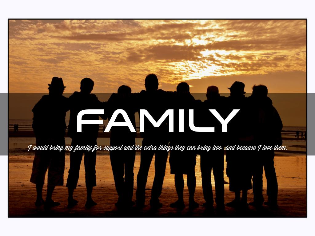 I would bring my family for support and the extra things they can bring two ;and because I love them.