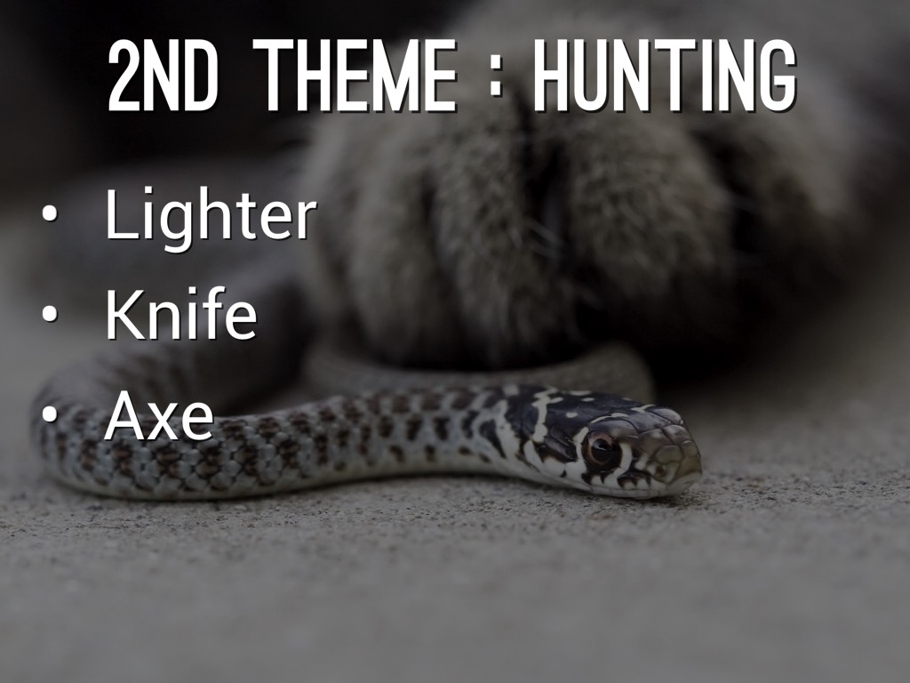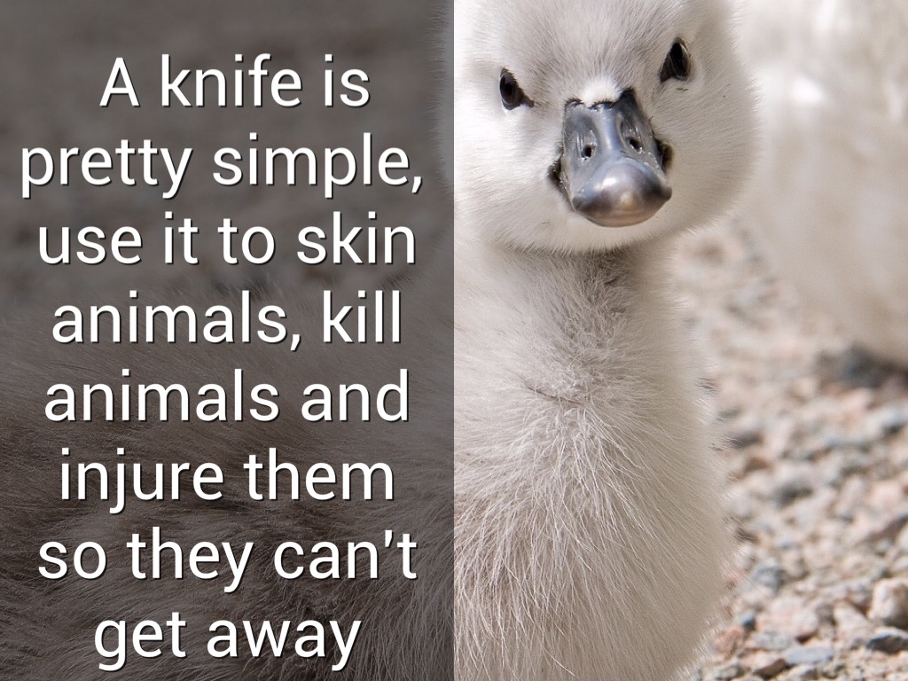 A knife is pretty simple, use it to skin animals, kill animals and injure them so they can't get away