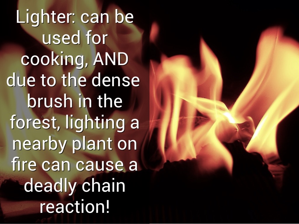 Lighter: can be used for cooking, AND due to the dense brush in the forest, lighting a nearby plant on fire can cause a deadly chain reaction!