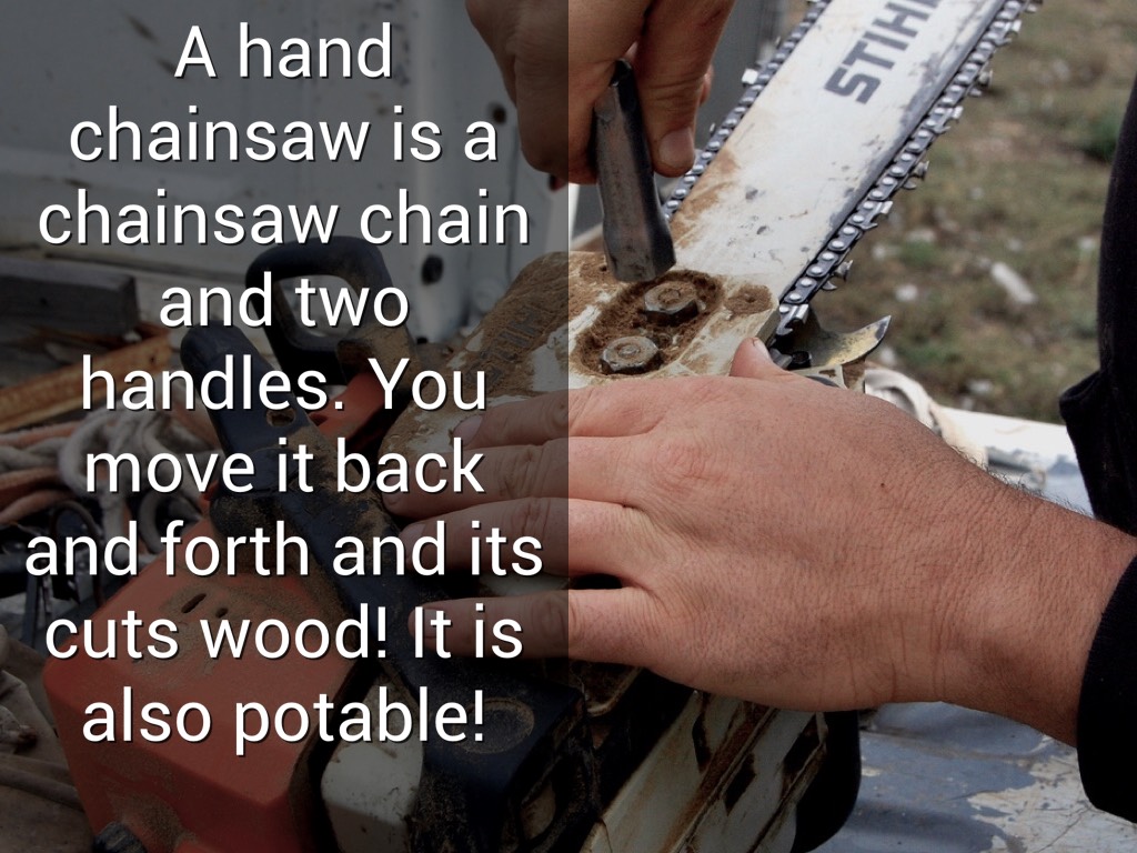 A hand chainsaw is a chainsaw chain and two handles. You move it back and forth and its cuts wood! It is also potable!