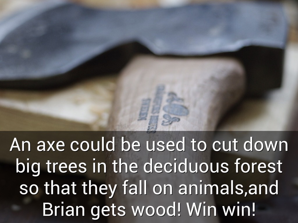 An axe could be used to cut down big trees in the deciduous forest so that they fall on animals,and Brian gets wood! Win win!