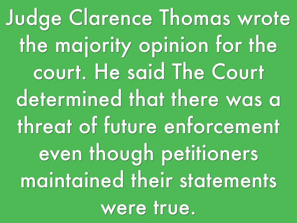 Judge Clarence Thomas wrote the majority opinion for the court. He said The Court determined that there was a threat of future enforcement even though petitioners maintained their statements were true.